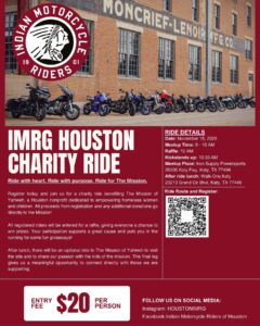 Let’s turn a Saturday into something bigger than miles. Join the Indian Motorcycle Riders Group of Houston for a community ride benefiting The Mission of Yahweh, a Houston nonprofit empowering homeless women and children. Every $20 entry goes straight to the Mission—so every throttle twist helps!