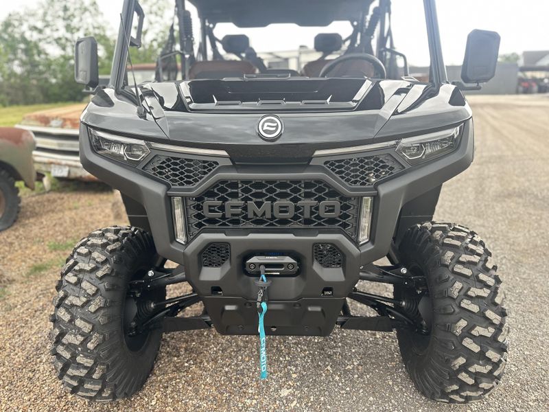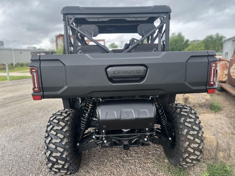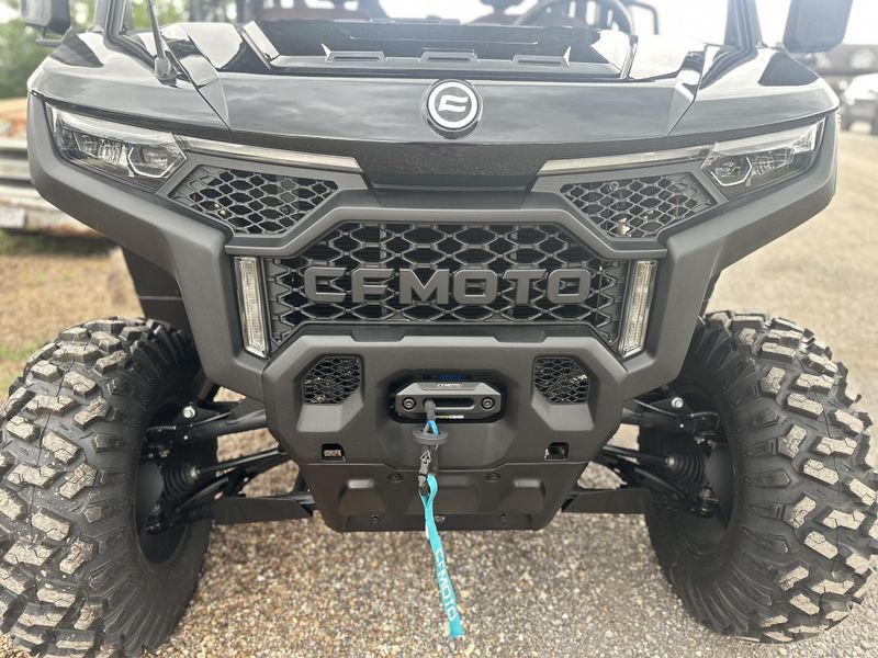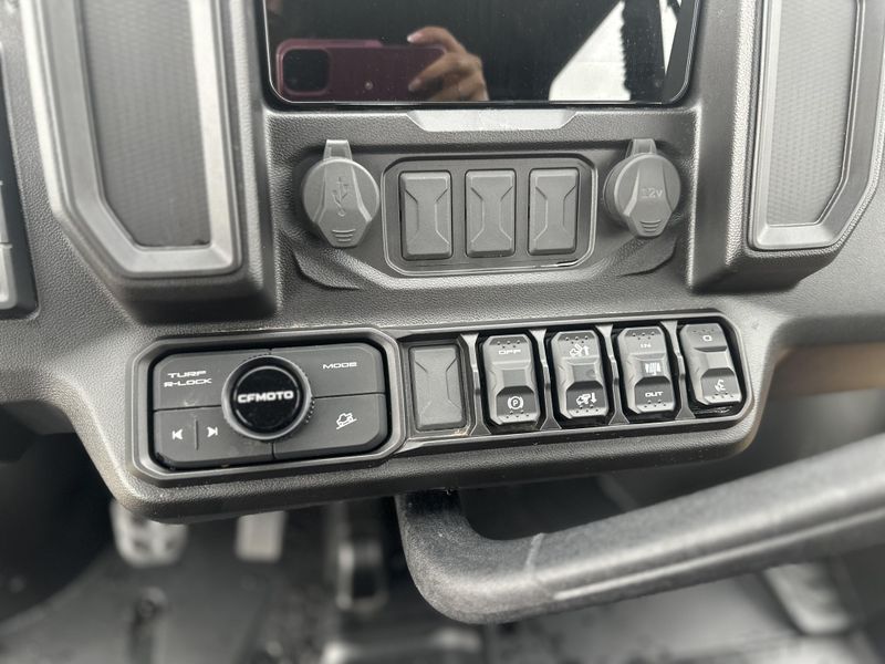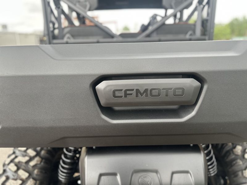 • ADDITIONAL FEATURES: Electronic power steering, Bosch® electronic throttle with work/normal modes, 4500 lb. winch with synthetic rope, two 3-person bench seats, side nets, CFMOTO LED™ headlights/taillights with backup lights, tilt steering wheel, CFMOTO RideSync app compatible (T-Box), 12V outlet, USB port, push button shifting, nfc key, 8” CFMOTO RideSync™ touch screen display, electronic / hydraulic tilt bed, skid plate, front & rear sway bars, Hill Descent Control, locking rear differential, side rear view mirrors, roof, bus bar, 2” receiver, adjustable driver seat, audio package