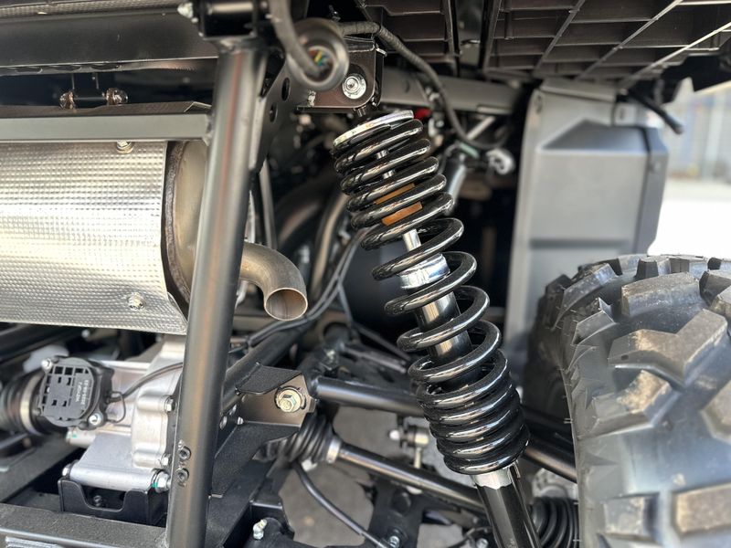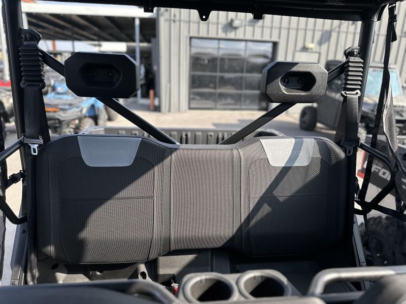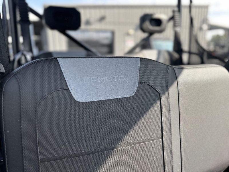 • ADDITIONAL FEATURES: Electronic power steering, Bosch® electronic throttle with work/normal modes, 4500 lb. winch with synthetic rope , two 2-person bench seat, 5” LCD display, CFMOTO RideSync app compatible (T-Box), 12V outlet, USB port, side nets, LED headlights/taillights with backup lights, tilt steering, roof, side mirrors, skid plate, rear sway bar, locking rear differential, large 10.5 gal. fuel tank, 2” receiver, adjustable driver’s seat, under-seat storage area, front bumper